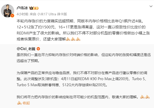 小米集团总裁卢伟冰同日发文表示,本轮内存涨价力度远超预期,同版本内存价格较去年Q1飙升近4倍,其中12+512版本涨价约1500元,16+1T版本涨幅更为明显,这对以极致性价比为定价核心的REDMI造成较大影响,因此不得不对部分机型零售价格做出小幅上涨或恢复原价的调整。
