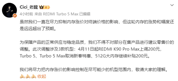 4月3日,小米中国区市场部总经理魏思琪表示,4月11日起,REDMI K90 Pro Max上调200元,Turbo 5、Turbo 5 Max取消新春特惠、512G大内存继续补贴200元。她还表示,将尽力把内存涨价的影响控制在尽可能少的机型范围内。