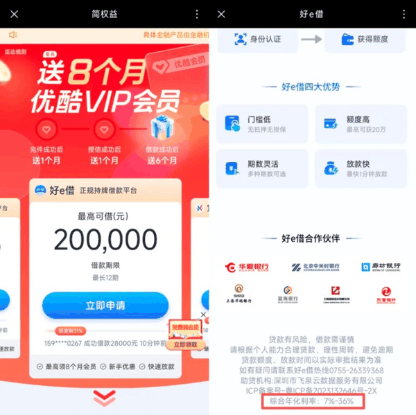 优酷视频APP-我的-借钱(简权益)正在做活动,最高送8个月优酷VIP会员(完件成功后送1个月,授信成功后送1个月,借款成功后送6个月)。优酷借钱合作引流的“好e借”页面显示, 综合 年化利率7%-36%,合作伙伴包括: 华夏银行 、 中关村 银行 、廊坊 银行 、华瑞 银行 、蓝海银行、云南 信托 、东莞银行。