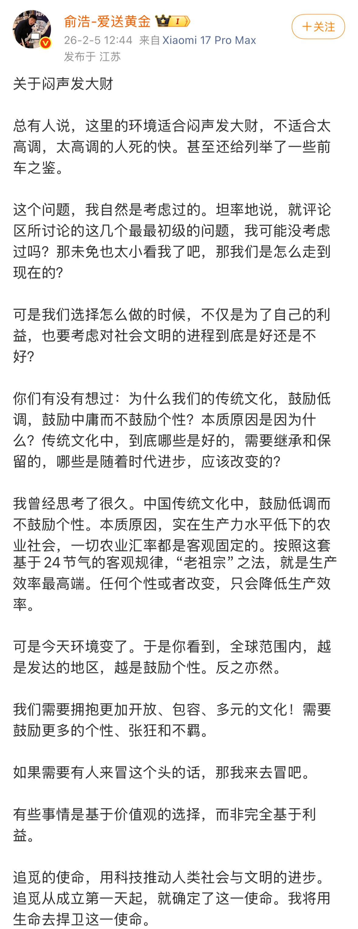 俞浩最近成为了网络红人。上场之前,他还忙着在微博上送黄金、抽锦鲤,在各种追觅的流言下和网友交流辩论。他近期一条出圈的朋友圈是:“我 想 把人类价值最高的企业再推高一个数量级,把追觅生态做到一百万亿美金量级。”