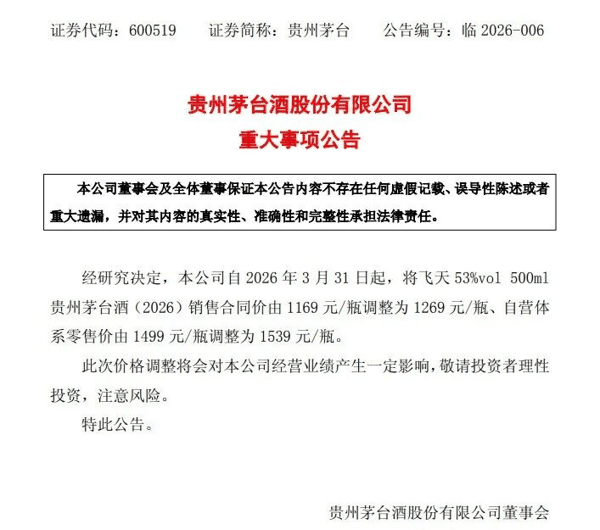 3月30日, 贵州茅台 发布公告,宣布自3月31日起,上调53%vol 500ml 贵州茅台 酒(2026)的销售合同价与自营体系零售价。其中,出厂价(销售合同价)由1169元/瓶调整为1269元/瓶,自营体系零售价由1499元/瓶调整为1539元/瓶。