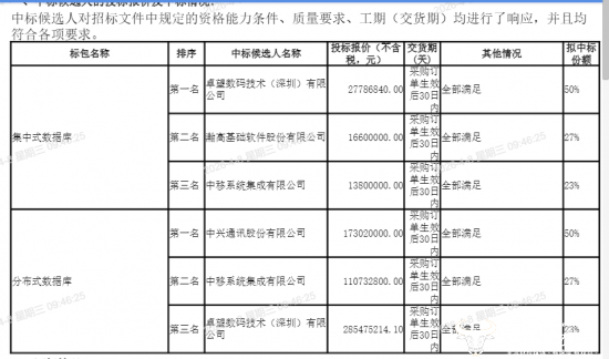 集中式数据库标包中,第一名至第三名分别是 卓望数码技术(深圳)有限公司、瀚高基础软件股份有限公司、中移系统集成有限公司 ,拟中标份额对应为 50%、27%、23%;分布式数据库标包中,第一名至第三名候选人分别为 中兴通讯、中移系统集成、卓望数码 ,拟中标份额对应为 50%、27%、23%。