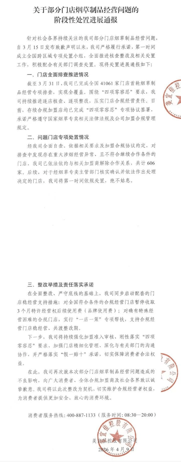 经全面自查,依据相关要求及加盟合规协议约定,对排查中发现存在重大涉烟经营异常、且不符合继续合作条件的门店,公司已依法依约与相关加盟商解除合作关系,共计606家。后续,对于经烟草专卖主管部门核实确认并依法作出处理决定的门店,公司将第一时间依规处置,绝不姑息。