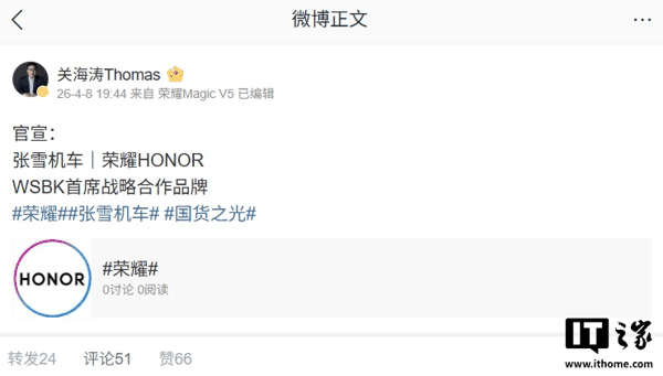 IT之家 4 月 8 日消息,荣耀全球首席营销官关海涛今晚宣布与张雪机车开展联名合作,荣耀成为张雪机车在世界超级摩托车锦标赛(WSBK)的首席战略合作品牌,共同推动中国智造品牌走向世界。