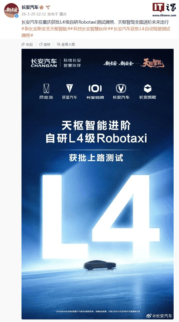 IT之家 3 月 29 日消息,长安汽车官方刚刚发文宣布, 其在重庆获批 L4 级自研 Robotaxi 测试牌照 。根据官方海报预热信息来看,长安汽车自研 Robotaxi 将搭载天枢智能解决方案。