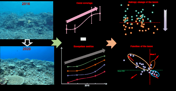 珊瑚礁生态系统是地球上生产力最高、生态价值最为突出的生态系统之一,在维持生物多样性、支撑渔业资源以及保护海岸线等方面发挥着不可替代的作用。然而,目前超过90%的珊瑚礁正面临全球气候变化与人为干扰的双重威胁,仅2009年至2018年间全球就有14%的珊瑚礁消失。在此背景下,如何维持并提升珊瑚礁的恢复力,已成为其保护工作的核心议题。现有相关研究多聚焦于珊瑚的物种组成与多样性,认为群落稳定性和高物种多样性是恢复力的潜在指标;这些研究往往将能量流动与系统过程置于次要位置,缺乏对系统内部物质与能量动态的深入量化,难以揭示其恢复力形成的根本机制。