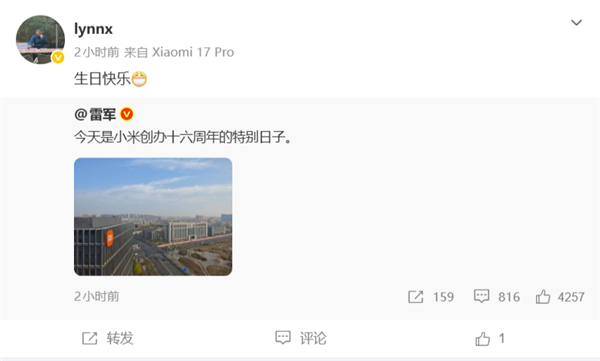 雷军晒图庆祝小米创办16周年!16年老员工感恩:生日快乐永远相信美好的事情即将发生