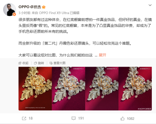 【天极网手机频道】 刚刚,OPPO Find系列产品负责人卓世杰通过个人微博发布长文,首次详细解读了即将于4 月21日发布的Find X9系列旗舰手机的核心影像技术——第二代丹霞色彩还原镜头,并同步放出一组红底黄金饰品的对比样张,直击当前手机影像色彩还原的行业痛点。