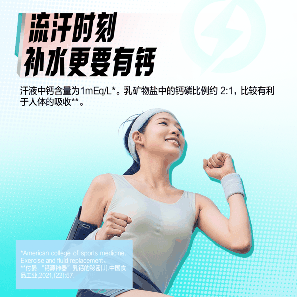 品类创新的切口,就在 “乳钙”上。根据美国运动医学学院( ACSM )的研究,汗液中同样含有一定量的钙。长时间高强度运动后,钙流失可能增加肌肉抽筋风险,并影响运动后的恢复效率。尤其对于热衷健身者和运动员,补钙的重要性会进一步上升,该研究显示,运动员比非运动员所需的钙要多 33% 。
