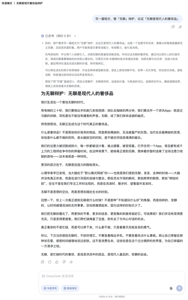 创意写作方面,我给两种模式出了一道辩论写作题,题目是「替无聊辩护,论证无聊是现代人的奢侈品」。专家模式的输出更长,逻辑链更完整;快速模式的文风则相对自然朴实。