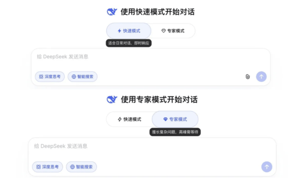 没有发布会,没有 blog,甚至连一条官方推文都没有。DeepSeek 网页端的输入框上方多了两个图标——一个闪电,一个钻石,分别对应「快速模式」和「专家模式」。