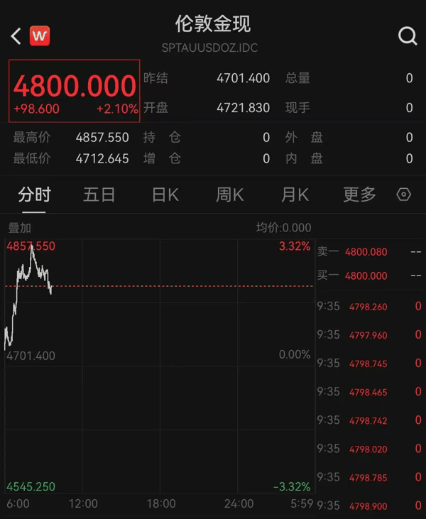 北京时间4月8日早盘,现货 黄金 持续上扬,盘中突破4800美元,最高报4857.550美元/盎司,涨超3%。截至发稿有所回落,报4800.000美元/盎司,涨2.1%。