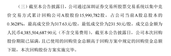 公告还指出,本次公司实施股份回购的资金总额、回购价格、回购股份数量、回购实施期限等,与公司董事会审议通过的回购方案不存在差异。公司实际回购金额已达回购方案中规定的回购资金总额下限,且未超过回购资金总额上限,本次回购符合既定的回购股份方案。