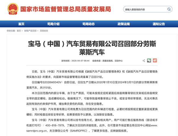 中新网 4月7日电(吴家驹)国家市场监督管理总局质量发展局网站显示,日前,宝马(中国)汽车贸易有限公司根据《缺陷汽车产品召回管理条例》和《缺陷汽车产品召回管理条例实施办法》的要求,向国家市场监督管理总局备案了召回计划。