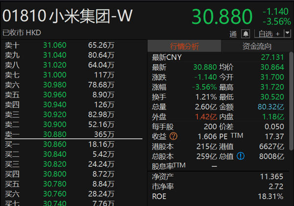 2026年4月2日收盘,小米集团股价报收30.88港元,下跌3.56%,成交量2.6亿股,成交额80.32亿港元。今年以来,小米股价已累计下跌21%。