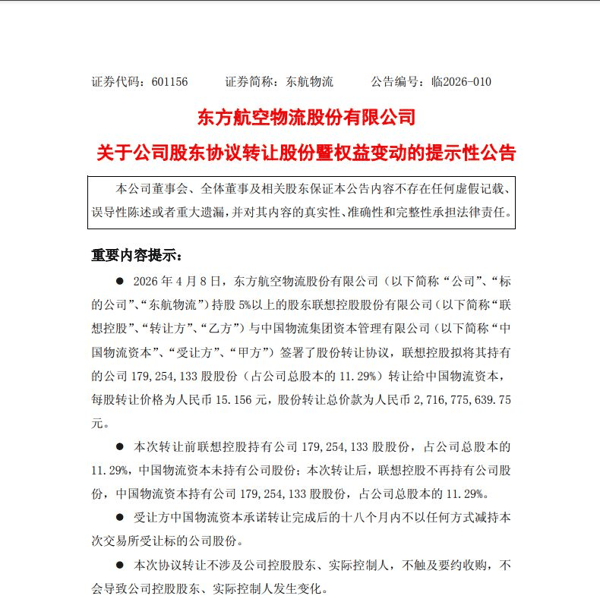 对于本次协议转让的交易背景和目的,东航物流称,是联想控股根据自身业务安排及需要而进行的交易。