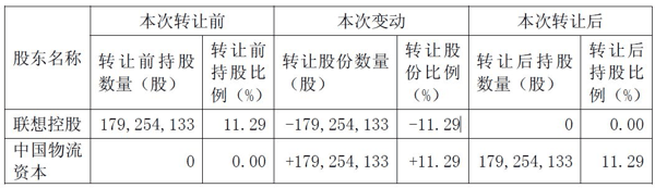 据公告,本次转让后,联想控股不再持有公司股份,中国物流资本将持有公司11.29%股份,且后者(即受让方)承诺受让股份完成后18个月内不减持。