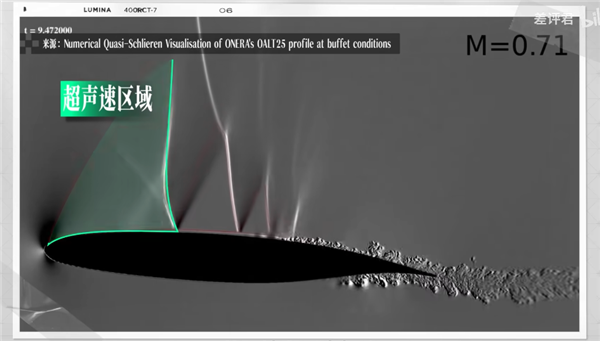 与此同时,在当气流穿过 “ 音速区 ” 的边界时,剧烈的压强变化还会让原本和机翼紧密贴合的气流从表面分离,让升力急剧下滑。