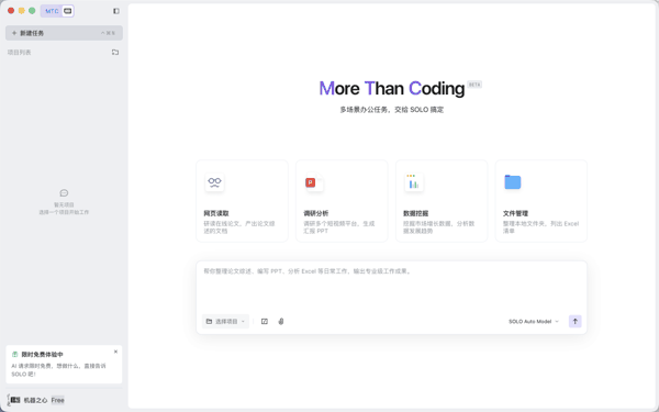 此前,我们在测试用 TRAE SOLO 打造大模型智囊团 时,已经验证了 TRAE 的 SOLO 模式在处理复杂工程时的强悍实力。但那时它深度绑定在传统的 IDE 架构中,复杂的开发环境依然把许多非研发人员挡在了门外。这一次,TRAE 选择 跳出 IDE 的束缚 ,将强大的智能体能力提取出来,放置在一个更加纯粹且直观的独立环境中。