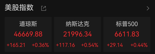 中新经纬4月7日电 美东时间周一,美股三大指数集体上涨。截至收盘,道指涨幅为0.36%,报46669.88点;纳指涨幅为0.54%,报21996.34点;标普500指数涨幅为0.44%,报6611.83点。