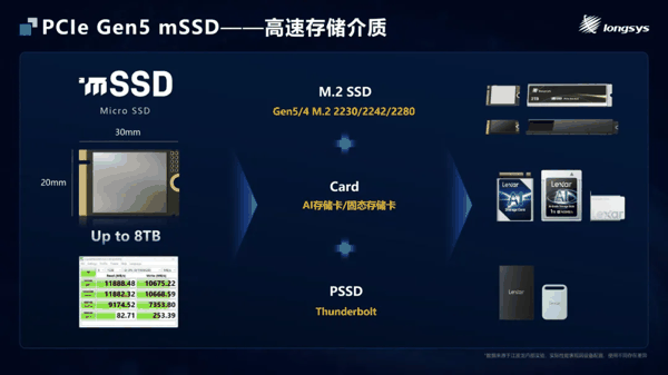 IT之家 3 月 30 日消息,江波龙 Longsys 在上周举行的 CFMS | MemoryS 2026 上宣布将其采用集成封装的 mSSD (Micro SSD) 产品线扩展至 PCIe Gen5,相较原有的 Gen4 解决方案实现显著性能提升。