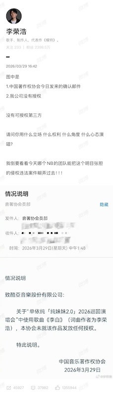 一切变化始于3月29日。向来以松弛形象示人的李荣浩,当天在 微博 发布一篇措辞严厉的长文,喊话新生代歌手单依纯:“请问你用什么立场、什么权利、什么角度、什么心态演唱?”他晒出中国音乐著作权协会的确认邮件,证明自己从未授权单依纯在深圳演唱会上翻唱他的代表作《李白》。这场版权纠纷迅速登上热搜。