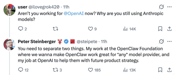 「你需要把两件事区分开来:我在 OpenClaw Foundation 的工作,是希望让 OpenClaw 能够很好地兼容所有的模型 / 提供商;而我在 OpenAI 的工作,则是帮助他们制定未来的产品战略。」