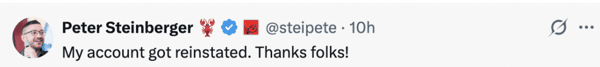 但「封禁」时间没有持续太久,仅仅两个小时后,Peter Steinberger 再次发文:「我的账号被恢复了,谢谢大家!」