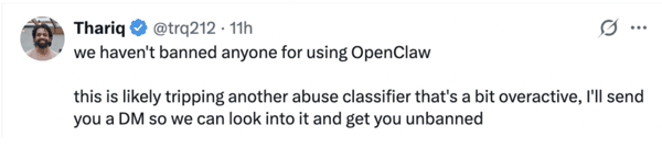 随着帖子热度的高涨,之后,Anthropic 的一位工程师 Thariq Shihipar 也「入场」了。他表示, 「我们并没有因为使用 OpenClaw 而封禁任何人。这很可能是触发了另一个有点过于敏感的滥用检测分类器。我会给你发私信,我们一起看看情况,帮你解除封禁。」