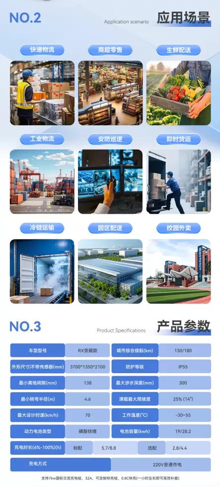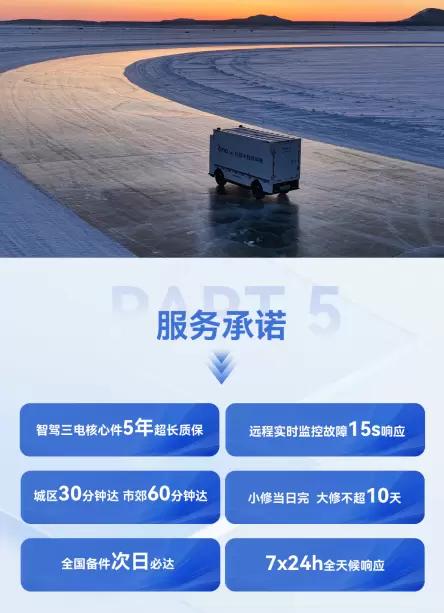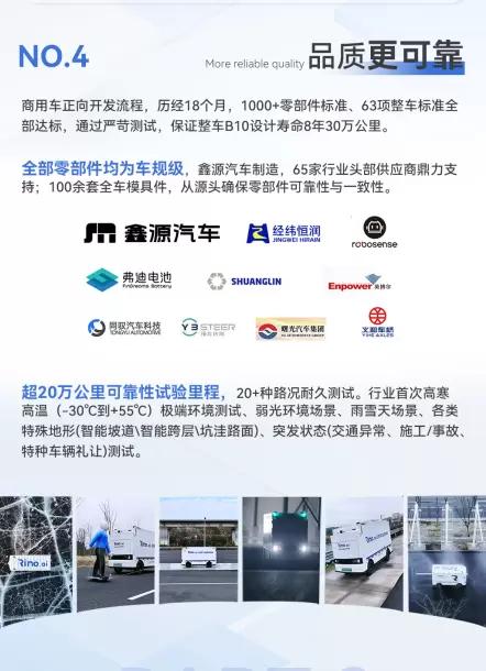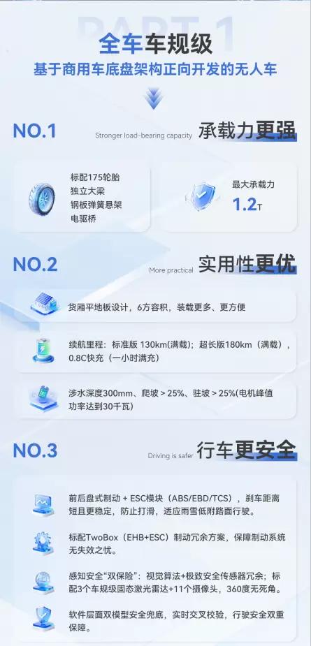 作为专为同城货运场景打造的Robovan产品,RX是行业首款严格遵循商用车标准正向开发的无人配送车,已实现量产并投入客户实际运营。产品具备"全车车规级、全栈式智能、全场景适配"核心优势,历经18个月正向开发,通过极端环境测试与超20万公里可靠性验证,B10设计寿命达8年30万公里。整车基于商用车底盘架构,最大承载力1.2吨,配备6方大容量货厢,提供130km标准续航款和180km超长续航款双版本,可轻松应对各类复杂城配路况与多场景需求。
