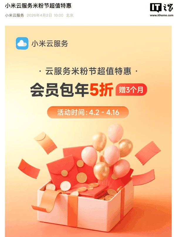 据IT之家此前报道,小米在 4 月 2 日官宣开启了 2026 年度米粉节活动,首发活动包括包年购买云服务会员可享 5 折优惠,同时额外赠送 3 个月时长,活动将于 4 月 16 日结束。