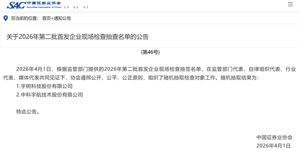 快科技4月1日消息, 今日,中国证券业协会官网发布“2026年第二批首发企业现场检查抽查名单”,宇树科技股份有限公司被抽中现场检查。
