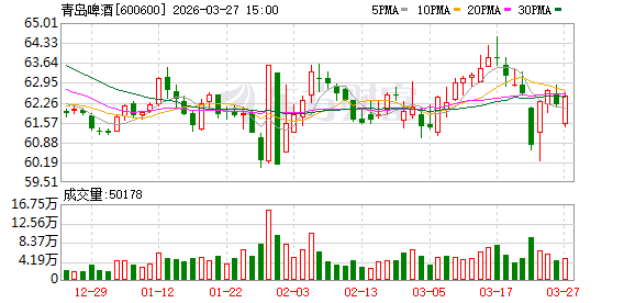 据 大智慧 VIP,截至3月26日收盘,青岛啤酒报62.20元/股,跌0.75%;港股 青岛啤酒股份 报48.64港元/股,跌1.62%。