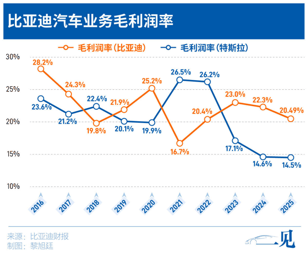 2025年,比亚迪汽车业务毛利率从22.31%降至20.49%。根据财报数据,在不计算所得税前提下,比亚迪的汽车业务利润总额为284亿元,同比2024年的363.32亿元下滑21.78%。 按全年销量460万辆计算,比亚迪单车利润约为6174元,同比下滑近三成,2024年这一数字约为8500元。