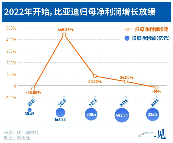 比亚迪披露的业绩报告显示,2025年,比亚迪营收突破8040亿元,同比增长约15%;归母净利润却降至326亿元,同比下滑近19%,甚至低于市场预期的343亿元至352亿元之间。