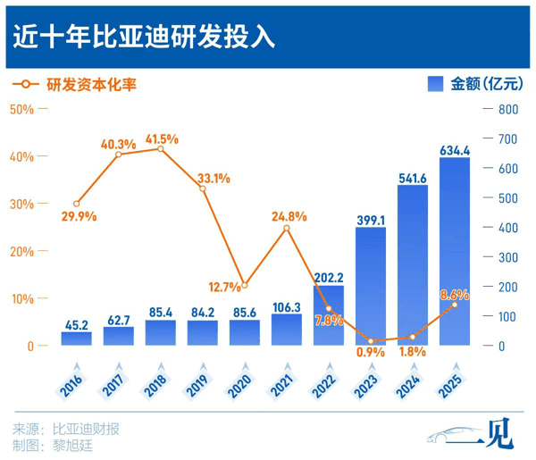 比如2025年,比亚迪研发投入高达634亿元,同比增长17%, 研发费用化率达到91.4%,其对应的研发资本化率仅为8.6%。绝大部分研发投入在当期直接计入费用,未来不需要背负大量摊销成本,这也是它“增收不增利”的原因之一, 用短期利润换取长期竞争力的战略选择。