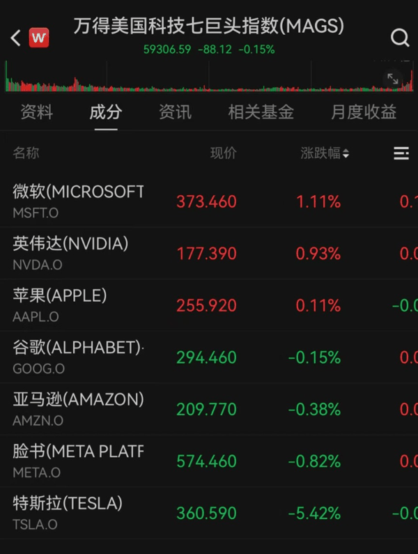 美股大型科技股表现分化,万得美国科技七巨头指数跌0.15%。 微软 上涨逾1%, 英伟达 涨近1%, 苹果 微涨0.11%, 特斯拉 跌超5%。