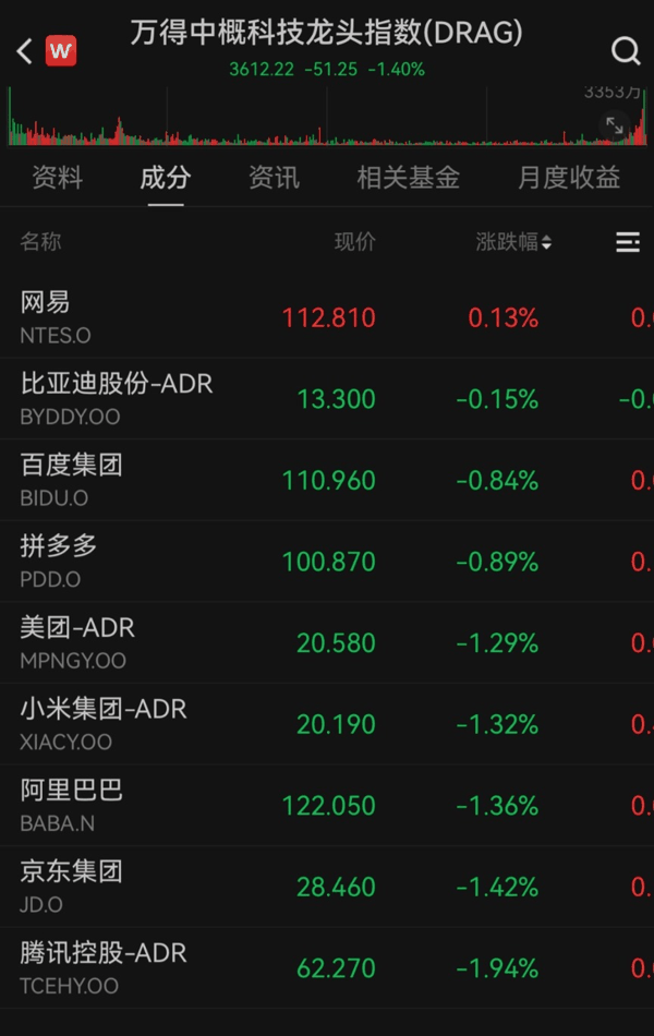 中概股方面, 纳斯达克 中国金龙指数跌0.34%,万得中概科技龙头指数跌1.4%。 网易 上涨0.13%, 京东 集团、 阿里巴巴 跌超1%。