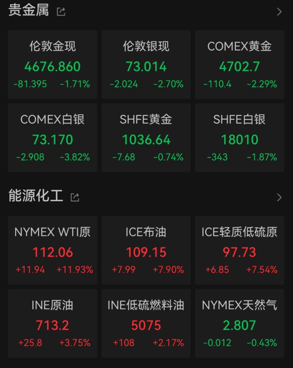 大宗商品方面,国际油价大幅飙升,截至北京时间4月3日5:39,WTI原油主力合约涨近12%,报112.06美元/桶; 贵金属 承压走低,COMEX 黄金 期货 价格跌逾2%。