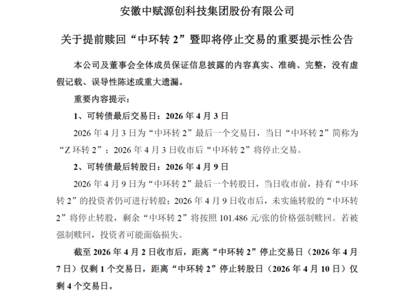 4月2日晚间, 中赋科技 发布关于提前赎回“中环转2”暨即将停止交易的重要提示性公告,提醒投资者4月3日为中环转2最后一个交易日,4月9日是最后一个转股日,债券持有人应及时卖出或转股。4月9日收市后,未实施转股的中环转2将全部冻结,停止交易和转股。
