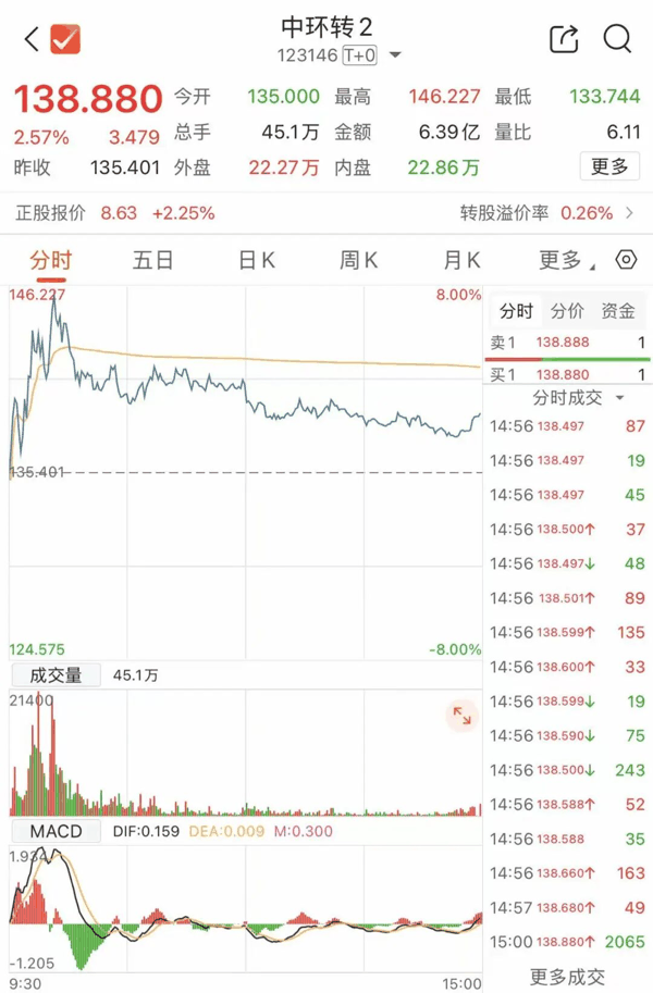 截至4月2日收盘,中环转2收盘价为138.88元/张。对照强赎价格,投资者若是未及时操作,或将亏损近27%。截至目前,中环转2仍有0.56亿元余额尚未完成交易或转股,所占比例超过6%。