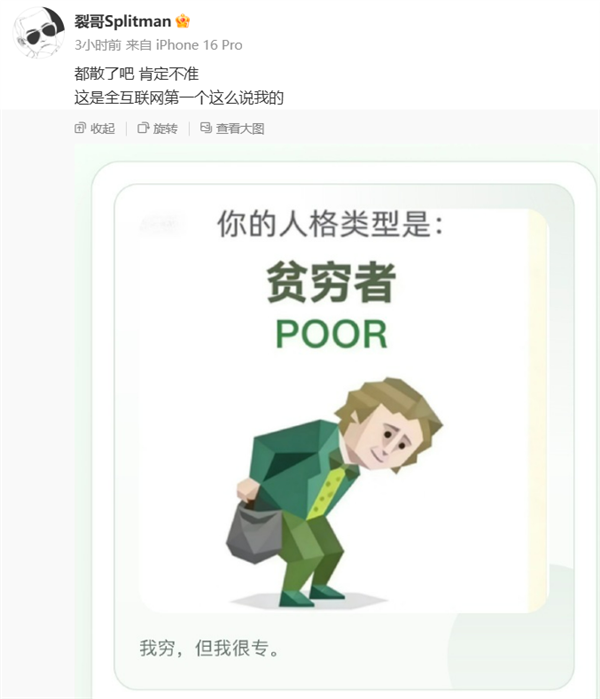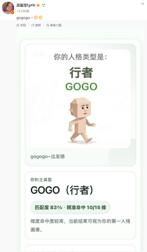 明星也加入了这股热潮,演员蓝盈莹在社交平台分享了自己的测试结果,歌手苏醒则自嘲测出的是贫穷者,还调侃道“都散了吧,肯定不准”,引发网友热议。