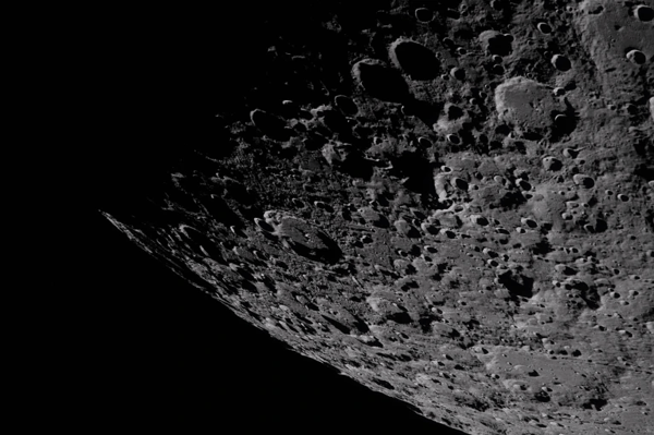 月球南极-艾肯盆地布满撞击坑的崎岖地形,以及明暗交错的晨昏线。图片来源:NASA