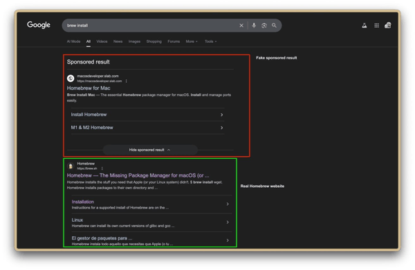 据报道,这种骗术的根源是骗子在谷歌购买搜索引擎推广服务,只要给钱就可以将伪造的 Homebrew 官网置顶展示在真官网之上,然后诱导用户执行一条恶意的终端命令。