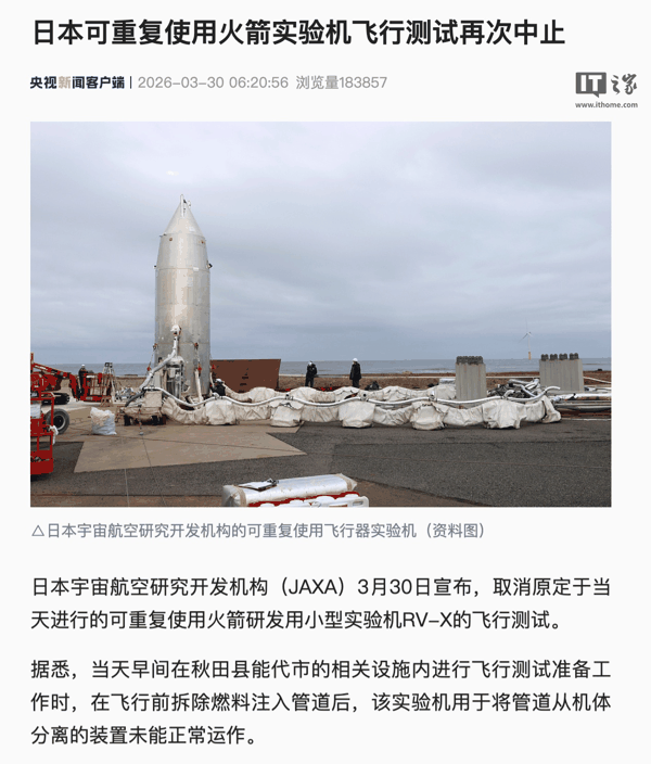 IT之家 3 月 30 日消息,据央视新闻报道,日本宇宙航空研究开发机构(JAXA)3 月 30 日宣布,取消原定于当天进行的可重复使用火箭研发用小型实验机 RV-X 的飞行测试。据悉,当天早间在秋田县能代市的相关设施内进行飞行测试准备工作时,在飞行前拆除燃料注入管道后,该实验机 用于将管道从机体分离的装置未能正常运作 。