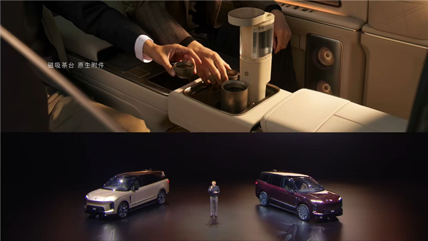 再说一个关键点,就是 ES9 这次可以选装一个带中岛的版本,里面藏着一个杯架和小桌板,假如老板没吃饭,也可以快速吃个盒饭啥的。。。