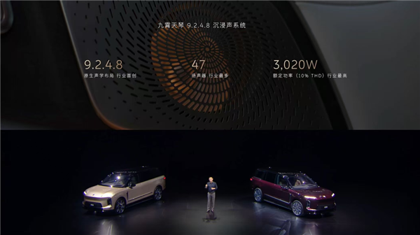 另外这个 9.2.4.8 的布局也很讲究,9 代表 9 组环绕单元,2 是 2 个超低音扬声器,4 是 4 个天空扬声器,8 则是 8 个二分头枕音响(也就是 16 个扬声器),碳纤维、凯芙拉和铝合金的顶级材质,再加上天琴钻石高音。
