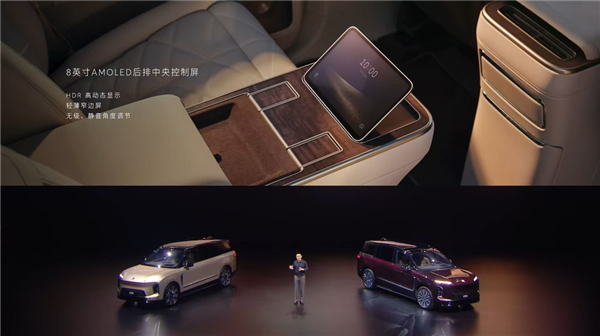 而要说冰箱、沙发都有了,肯定还得来个彩电,ES9 的这块后排屏其实和中岛直接合体了,而对于工作、娱乐的需求,ES9 既没有选择头顶电视,也不是投影仪,而是椅背后的两块 Pad 。