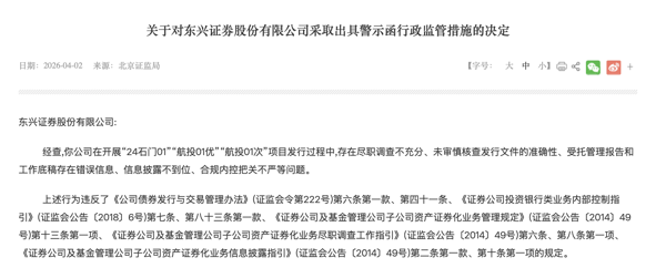 尽调“走过场”,东兴证券债券发行“踩红线”,监管警示函直指五大违规