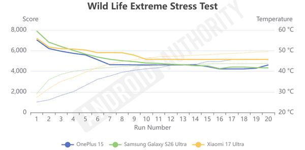 这种图形性能领先优势却转瞬即逝。三星机型在三款设备中升温最快,迅速触发系统降频机制,经过 4 分钟高强度图形渲染,三款手机的性能表现完全回归同一水平线。